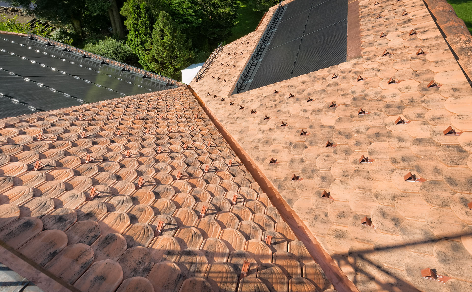 Die Photovoltaik ist derart gekonnt in das neue Biberschwanz-Ziegeldach integriert, als gehörte sie schon immer dazu.