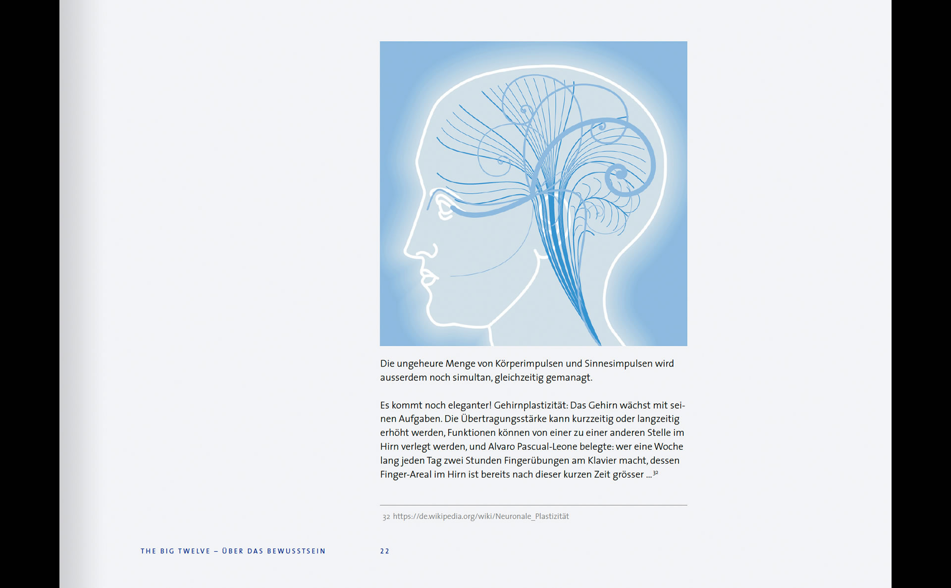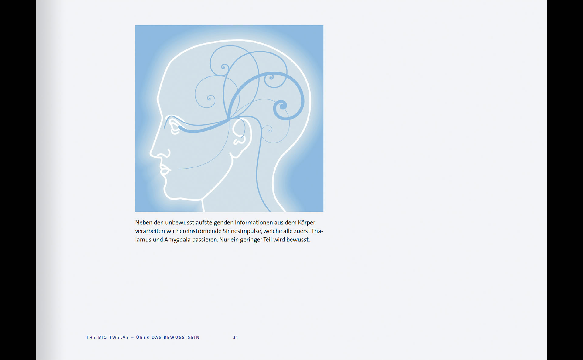 Komplexe Zusammenhänge, Abläufe, noch dazu im Innern, lassen sich illustrativ darstellen, verständlich machen und bildlich viel leichter erinnern. Mit «The Big Twelve» soll eine kompakte Illustration entstehen, wie das Bewusstsein funktioniert, auf dem neusten Stand des Wissens.